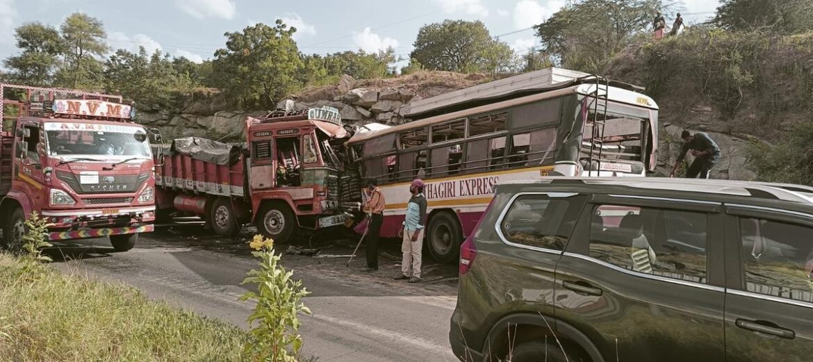തിരുപ്പതിയില്നിന്ന് ബെംഗളൂരുവിലേക്ക് പോകുകയായിരുന്ന ബസ് രണ്ട് ലോറികളിലായിട്ടാണ് ബസ് ഇടിച്ചത്. പരിക്കേറ്റവരില് നിരവധി ആളുകളുടെ നില അതീവ ഗുരുതരമാണ്. ഇവരെ വിവിധ ആശുപത്രികളിലായി പ്രവേശിപ്പിച്ചിട്ടുണ്ട്. തിരുമല ക്ഷേത്രത്തില് സന്ദര്ശനം നടത്തി തിരിച്ചുപോകുകയായിരുന്ന തീര്ത്ഥാടകരാണ് ബസിലുണ്ടായിരുന്നവരില് ഏറെയും.