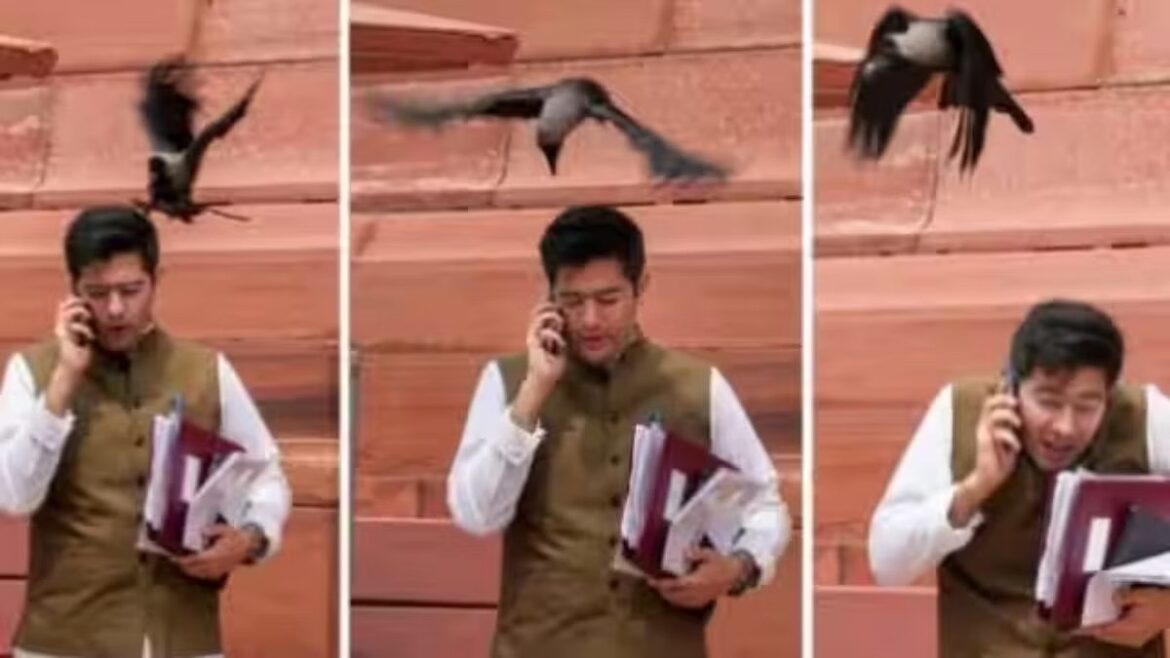 പാര്ലമെന്റിനു പുറത്തേക്ക് ഫോണില് സംസാരിച്ചു നടന്നു വന്ന ഛദ്ദയുടെ തലയ്ക്കു മുകളില് ഒരു കാക്ക വട്ടമിട്ടു പറക്കുന്നതും പിന്നാലെ തലയ്ക്കിട്ട് ഒരു കൊത്തു കൊടുക്കുന്നതും പകര്ത്തിയിട്ടുണ്ട്. കൊത്ത് ലഭിച്ചതിനു പിന്നാലെ രാഘവ് ഛദ്ദ കുനിയുന്നതും ഫൊട്ടോഗ്രാഫര് ഷഹബാസ് ഖാൻ പകര്ത്തിയിട്ടുണ്ട്.