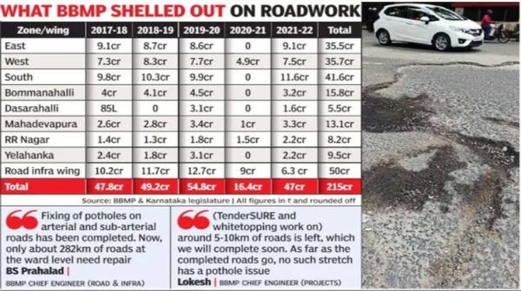 ബെംഗളൂരു: കഴിഞ്ഞ അഞ്ച് വർഷത്തിനിടെ ബിബിഎംപി പരിധിയിലെ കുഴികൾ കാരണം 13 പേരെങ്കിലും മരിച്ചതായി ഔദ്യോഗിക രേഖകൾ കാണിക്കുന്നു, അതേസമയം തകരാർ പരിഹരിക്കാൻ സിവിൽ ഏജൻസി ഇതേ കാലയളവിൽ 215 കോടിയിലധികം രൂപ ചെലവഴിച്ചു.ബെംഗളൂരു നഗരത്തിലുടനീളം 12 അപകടങ്ങളിലായി 13 പേരുടെ ജീവൻ നഷ്ടപ്പെട്ടു. യെലഹങ്ക (2), ആർടി നഗർ (1), പീനിയ (1), കാമാക്ഷിപാളയ (1), ബാനസ്വാഡി (1), വൈറ്റ്ഫീൽഡ് (3), പുലകേശിനഗർ (1), യശ്വന്ത്പൂർ (1). 1), ചിക്ക് പെറ്റ് (1) പേർ മരിച്ചു. മരിച്ചവരിൽ നാല് സ്ത്രീകളും ഒമ്പത് പുരുഷന്മാരും ഉൾപ്പെടുന്നു. ആറ് പേർ 19 നും 30 നും ഇടയിൽ പ്രായമുള്ളവരും ഒരാൾ മുതിർന്ന പൗരനുമാണ്.2017-18 നും 2021-22 നും ഇടയിൽ കുഴികൾ നന്നാക്കാൻ ബിബിഎംപി 215 കോടി രൂപ ചെലവഴിച്ചതായി ഡാറ്റ വ്യക്തമാക്കുന്നു. പാലികയുടെ റോഡ് ഇൻഫ്രാസ്ട്രക്ചർ വിഭാഗം നടത്തിയപ്രവർത്തനങ്ങൾക്ക് കീഴിലാണ് ഏറ്റവും കൂടുതൽ (50 കോടി രൂപ) ചെലവഴിച്ചത്. ബാക്കി തുക എട്ട് സോണുകളിലായി ചെലവഴിച്ചു. സോണുകളിൽ, തെക്ക് (41.6 കോടി രൂപ) ഏറ്റവും കൂടുതൽ ചെലവഴിച്ചു. തൊട്ടുപിന്നാലെ പടിഞ്ഞാറും കിഴക്കും, ഏറ്റവും കുറവ് ചെലവഴിച്ചത് ദാസറഹള്ളിയിലാണ്.13 മരണങ്ങളിൽ ഏഴും 2021 ൽ സംഭവിച്ചതാണ്. അതേസമയം 2020 ൽ മൂന്ന് മരണങ്ങൾ ഉണ്ടായതായി മുഖ്യമന്ത്രി ബസവരാജ് ബൊമ്മ നിയമസഭയിൽ അടുത്തിടെ രേഖാമൂലം നൽകിയ പ്രതികരണത്തിൽ പറയുന്നു.