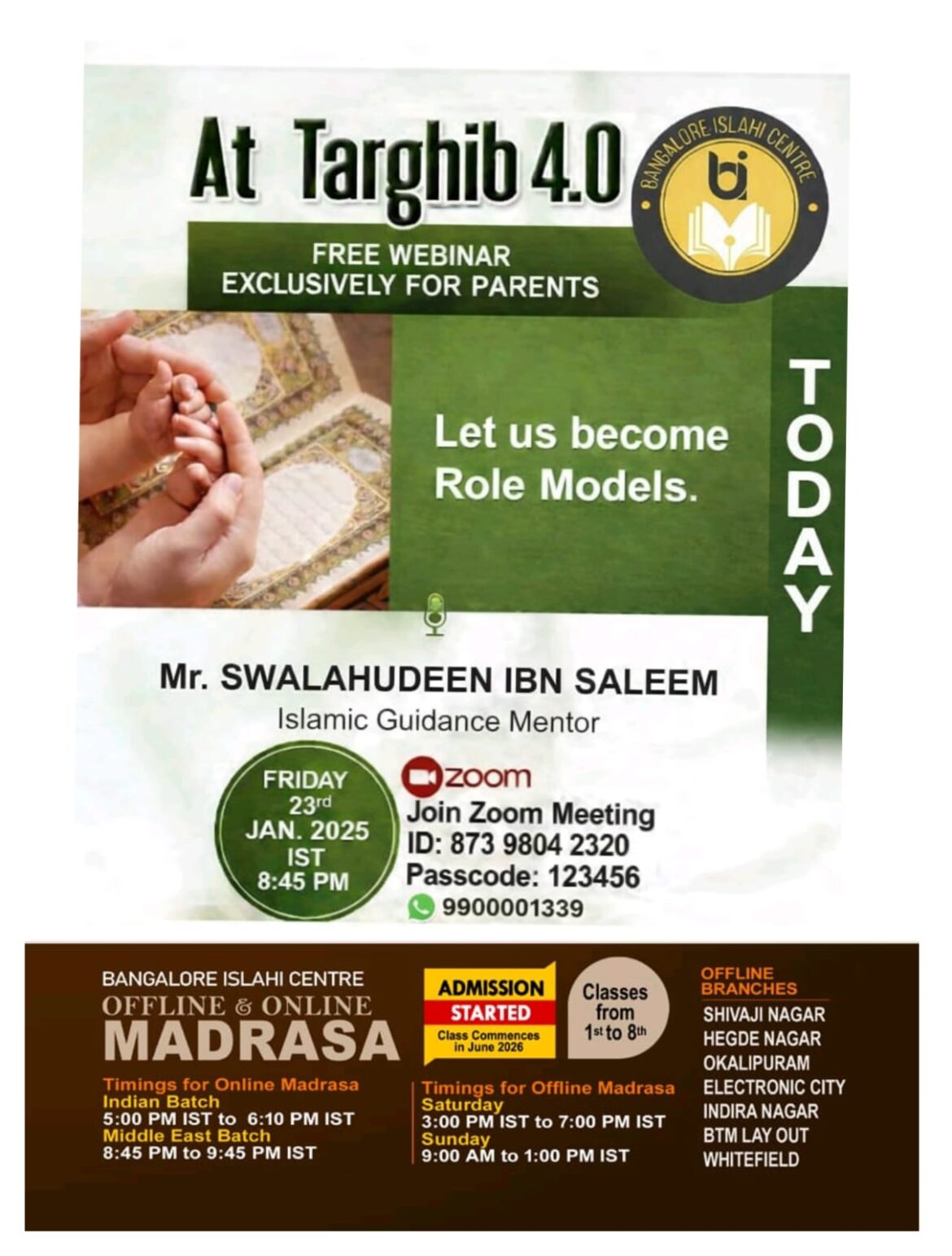 മക്കളുടെ ആത്മീയ ബോധവും ദീനി അറിവും ശക്തിപ്പെടുത്തുന്നതിൽ രക്ഷിതാക്കളുടെ പങ്ക് നിർണായകമാണെന്ന തിരിച്ചറിവിന്റെ അടിസ്ഥാനത്തിൽ, ബാംഗ്ലൂർ ഇസ്ലാഹി സെന്റർ മദ്രസാ രക്ഷിതാക്കൾക്കായി പ്രതിമാസം ഓൺലൈനായി സംഘടിപ്പിക്കുന്ന നോളജ് സെഷൻ പരമ്പരയായ ‘അത്തർഗീബ് 4.0’ ഇന്ന് വൈകിട്ട് 8.45ന് നടക്കും.