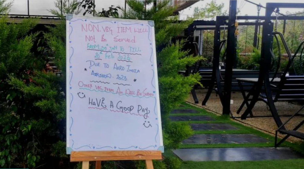 എയർ ഷോയ്ക്ക് വേണ്ട പരിശീലനം നടക്കുന്ന സ്ഥലങ്ങളിൽ ഇരപിടിയൻ പക്ഷികളുടെ സാന്നിധ്യം അകറ്റാൻ വേണ്ടിയാണ് മേഖലകളിൽ സസ്യേതര ആഹാരം വിലക്കുന്നത്. വിലക്ക് ലംഘിക്കുന്നവർക്കെതിരെ BBMP ആക്ട് 2020, ഇന്ത്യൻ എയർക്രാഫ്റ്റ് റൂൾസ് 1937 (റൂൾ 91) എന്നിവ പ്രകാരം നടപടിയെടുക്കുമെന്നും അധികൃതർ അറിയിച്ചിട്ടുണ്ട്.