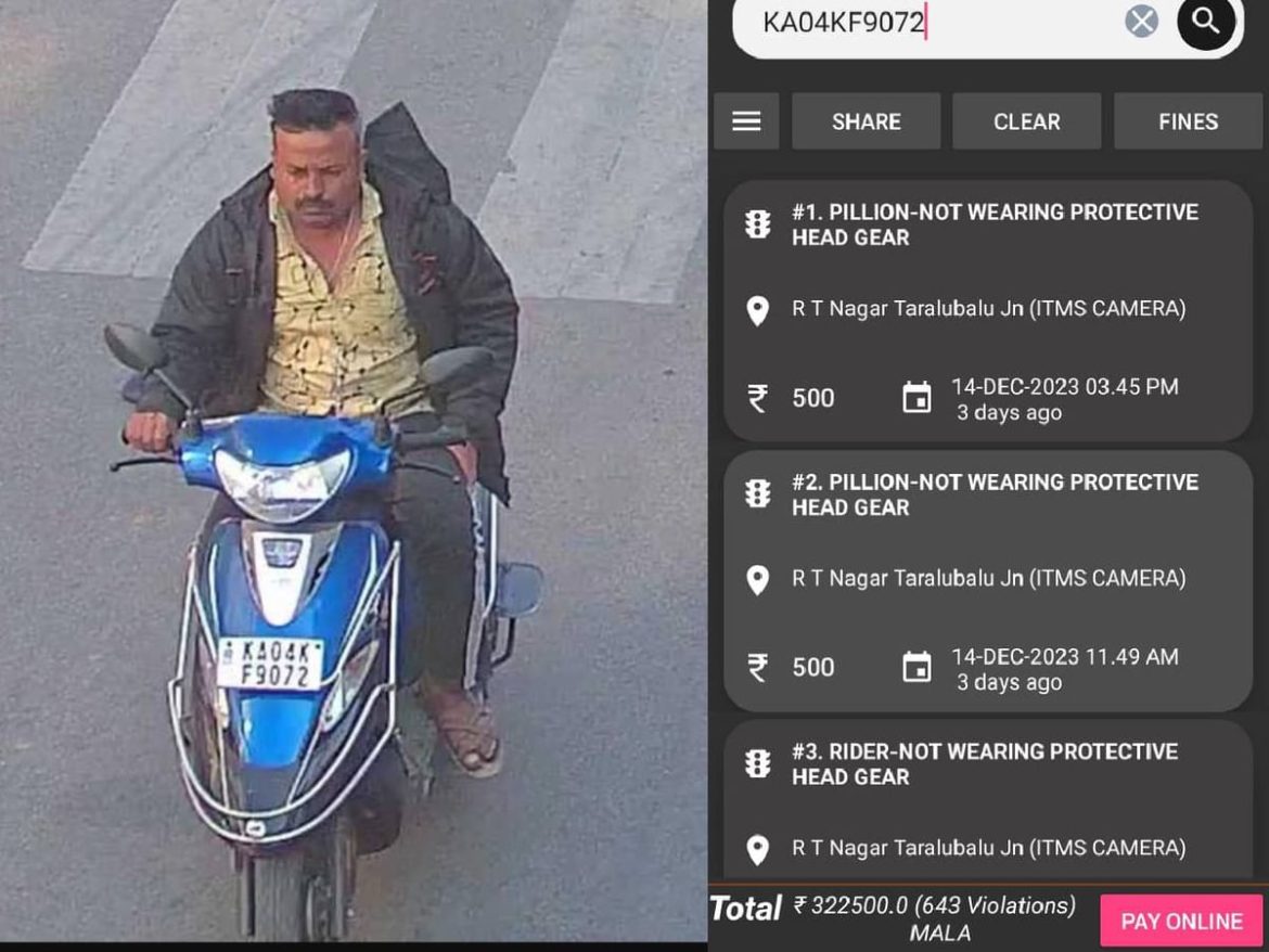 ഹെൽമെറ്റ് ധരിക്കാത്തതിനാണ് കൂടുതൽ കേസുകളും. ആർ.ടി. നഗർ പ്രദേശത്തുകൂടി ഒട്ടേറെത്തവണ ഹെൽമെറ്റില്ലാതെ യുവാവ് യാത്രചെയ്യുന്നത് ക്യാമറയിൽ പതിഞ്ഞ ചിത്രങ്ങളിൽനിന്ന് വ്യക്തമാണ്. നഗരത്തിൽ എ.ഐ. ക്യാമറകൾ ഉപയോഗിച്ചാണ് ഗതാഗത നിയമലംഘനം പരിശോധിക്കുന്നത്. 2022-ൽ 1.04 കോടി ലംഘന കേസുകളിൽ 96.2 ലക്ഷം കേസുകളും എ.ഐ. ക്യാമറകൾ ഉപയോഗിച്ച് കണ്ടെത്തിയതായിരുന്നു. 50 പ്രധാന ജങ്ഷനുകളിലായി 250 എ.ഐ. ക്യാമറകളും 80 ആർ.എൽ.വി.ഡി. ക്യാമറകളും സ്ഥാപിച്ചിട്ടുണ്ട്.