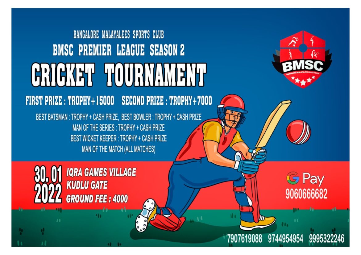 ബെംഗളൂരു: കഴിഞ്ഞ രണ്ടു വർഷത്തോളമായി ബെംഗളൂരു നഗരത്തിലെ മലയാളികൾക്കിടയിൽ പ്രവർത്തിച്ചു വരുന്ന ബാംഗ്ലൂർ മലയാളി സ്പോർട്സ് ക്ലബ്ബിന്റെ (ബി.എം.എസ്.സി) രണ്ടാമത് ക്രിക്കറ്റ് മത്സരം ഈ മാസം (ജനുവരി) 30 ആം തിയതി ബെംഗളൂരുവിലെ കുഡ്ലു ഗേറ്റിലുള്ള ഇഖ്റ ഗെയിംസ് വില്ലജ് എന്ന ഗ്രൗണ്ടിൽ വെച്ച് നടത്തുമെന്ന് സംഘാടക സമിതി അറിയിച്ചു.