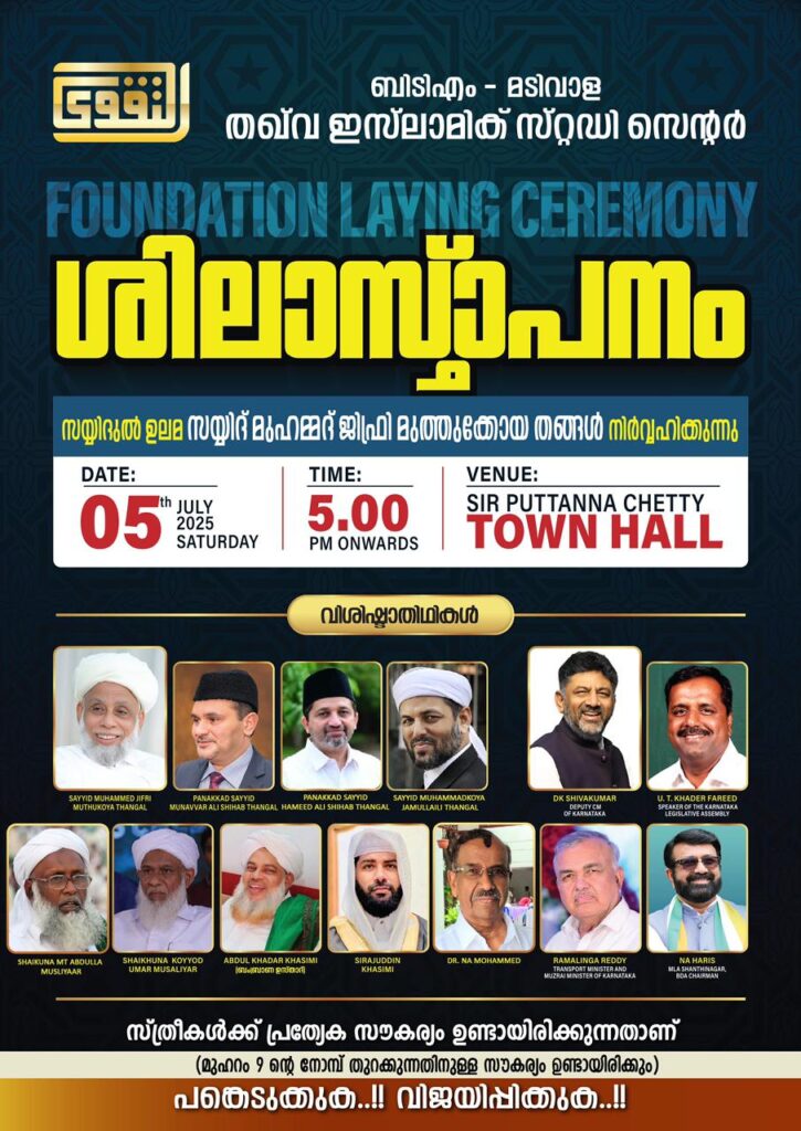 ബെംഗളൂരു | ജൂലൈ 5, 2025 – മഡിവാളയും ബി.ടി.എം സെക്കന്റ് സ്റ്റേജുമെല്ലാം ഉൾക്കൊള്ളുന്ന ബെംഗളൂരുവിന്റെ ഹൃദയഭാഗത്ത് ദീർഘകാലമായി വാടക കെട്ടിടങ്ങളിലും ടെറസുകളിലുമായി വിശ്വാസം പുലർത്തിയ മലയാളി മുസ്ലിം സമൂഹത്തിന് ഇനി സ്വയം സ്വന്തമായ ഒരു പ്രാർത്ഥനാലയം ലഭിക്കുന്നു. ‘ബി.ടി.എം – മഡിവാള തഖ്വ ഇസ്ലാമിക് സ്റ്റഡി സെൻ്റർ’ എന്ന പുതിയ സ്ഥാപനത്തിന്റെ ശിലാസ്മാപന ചടങ്ങ് ഈ ജൂലൈ 5-ാം തീയതി ശനിയാഴ്ച വൈകിട്ട് 5 മണിക്ക് സർ പുട്ടണ്ണ ചെട്ടി ടൗൺ ഹാളിൽ വച്ച് നടക്കും.ഈ ഉദ്ഘാടന ചടങ്ങ്, ഈ മേഖലയിലെ വിശ്വാസികൾക്ക് ഏറെ പ്രതീക്ഷയും ഉത്സാഹവും നല്കുന്ന ഒരു ചരിത്ര നാഴികക്കല്ലാണ്. ശിലാസ്ഥാപനം സമസ്ത കേരള ജംഇയ്യത്തുൽ ഉലമ പ്രസിഡന്റ് സയ്യിദ് മുഹമ്മദ് ജിഫ്രി മുത്തുക്കോയ തങ്ങൾ ആയിരിക്കും നിർവഹിക്കുന്നത് . കൂടാതെകർണാടക ഉപമുഖ്യമന്ത്രി ഡി.കെ. ശിവകുമാർ ഉൾപ്പെടെയുള്ള രാഷ്രീയ ആത്മീയ മേഖലകളിലെ പ്രമുഖ വ്യക്തിത്വങ്ങളും പരിപാടിയുടെ ഭാഗമാകും .