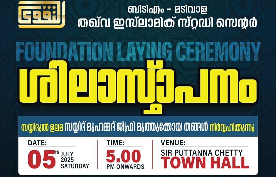 ബെംഗളൂരു | ജൂലൈ 5, 2025 – മഡിവാളയും ബി.ടി.എം സെക്കന്റ് സ്റ്റേജുമെല്ലാം ഉൾക്കൊള്ളുന്ന ബെംഗളൂരുവിന്റെ ഹൃദയഭാഗത്ത് ദീർഘകാലമായി വാടക കെട്ടിടങ്ങളിലും ടെറസുകളിലുമായി വിശ്വാസം പുലർത്തിയ മലയാളി മുസ്ലിം സമൂഹത്തിന് ഇനി സ്വയം സ്വന്തമായ ഒരു പ്രാർത്ഥനാലയം ലഭിക്കുന്നു. ‘ബി.ടി.എം – മഡിവാള തഖ്വ ഇസ്ലാമിക് സ്റ്റഡി സെൻ്റർ’ എന്ന പുതിയ സ്ഥാപനത്തിന്റെ ശിലാസ്മാപന ചടങ്ങ് ഈ ജൂലൈ 5-ാം തീയതി ശനിയാഴ്ച വൈകിട്ട് 5 മണിക്ക് സർ പുട്ടണ്ണ ചെട്ടി ടൗൺ ഹാളിൽ വച്ച് നടക്കും.ഈ ഉദ്ഘാടന ചടങ്ങ്, ഈ മേഖലയിലെ വിശ്വാസികൾക്ക് ഏറെ പ്രതീക്ഷയും ഉത്സാഹവും നല്കുന്ന ഒരു ചരിത്ര നാഴികക്കല്ലാണ്. ശിലാസ്ഥാപനം സമസ്ത കേരള ജംഇയ്യത്തുൽ ഉലമ പ്രസിഡന്റ് സയ്യിദ് മുഹമ്മദ് ജിഫ്രി മുത്തുക്കോയ തങ്ങൾ ആയിരിക്കും നിർവഹിക്കുന്നത് . കൂടാതെകർണാടക ഉപമുഖ്യമന്ത്രി ഡി.കെ. ശിവകുമാർ ഉൾപ്പെടെയുള്ള രാഷ്രീയ ആത്മീയ മേഖലകളിലെ പ്രമുഖ വ്യക്തിത്വങ്ങളും പരിപാടിയുടെ ഭാഗമാകും .