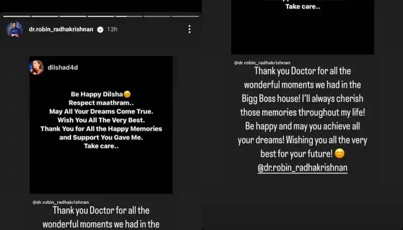 ‘സന്തോഷമായി ഇരിക്കൂ ദില്‍ഷ…. ബഹുമാനം മാത്രമെയുള്ളൂ… നിന്റെ എല്ലാ സ്വപ്നങ്ങളും സഫലമാകട്ടെ… എല്ലാവിധ ആശംസകളും നേരുന്നു. നീ നല്‍കിയ എല്ലാ ഓര്‍മകള്‍ക്കും നന്ദി…. നല്‍കിയ പിന്തുണയ്ക്കും നന്ദി പറയുന്നു…’ എന്നാണ് റോബിന്‍ കുറിച്ചത്. പിന്നാലെ മറുപടിയുമായി ദിൽഷയും എത്തി.