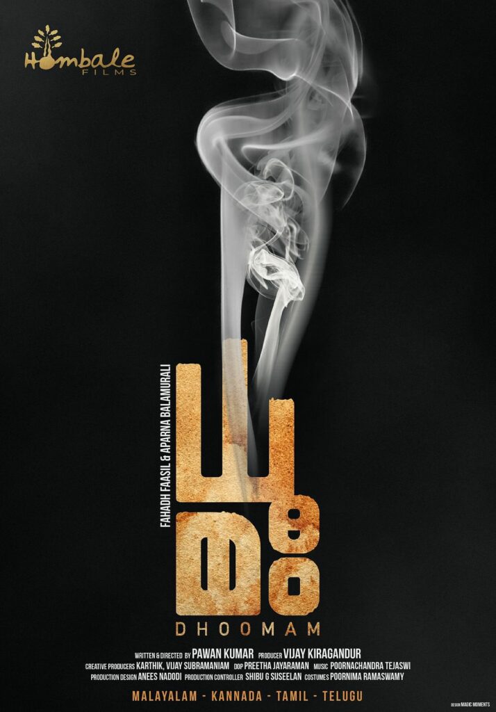 ലൂസിയ, യുടേണ് തുടങ്ങിയ ചിത്രങ്ങളുടെ സംവിധായകന് പവന്കുമാര് ആദ്യമായി മലയാളത്തിലൊരുക്കുന്ന ചിത്രത്തില് ഫഹദ് ഫാസില് നായകനാകുന്നു. അപര്ണ ബാലമുരളിയാണ് നായിക. ധൂമം എന്ന് പേരിട്ടിരിക്കുന്ന ചിത്രം നിര്മിക്കുന്നത് കെ.ജി.എഫ് നിര്മാതാക്കളായ ഹോംബാലെ ഫിലിംസാണ്. മലയാളം, കന്നഡ, തമിഴ്, തെലുങ്ക് എന്നീ ഭാഷകളിലൊരുക്കുന്ന ചിത്രം ഒക്ടോബര് ആദ്യവാരം ചിത്രീകരണം ആരംഭിക്കും. 2023 ലായിരിക്കും ചിത്രം തിയ്യേറ്ററുകളിലെത്തുക.