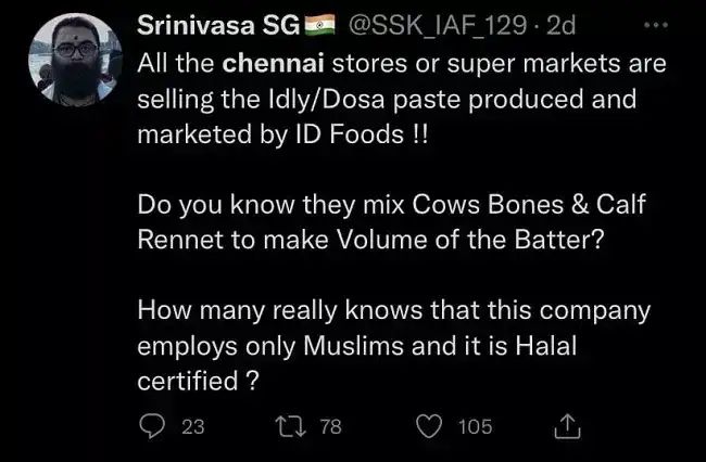 ഇന്ത്യന് എയര്ഫോഴ്സ് വെറ്ററന്, സംരംഭകന് എന്നെല്ലാം അവകാശപ്പെടുന്ന ശ്രീനിവാസ എസ്ജി സെപ്തംബര് നാലിന് പോസ്റ്റ് ചെയ്ത ട്വീറ്റിങ്ങനെ; ഐഡി ഇഡലി ദോശ മാവുകള് വില്ക്കുന്ന ചെന്നൈയിലെ എല്ലാ കടക്കാരോടും സൂപ്പര്മാര്ക്കറ്റുകളോടും, അവര് പശുവിന്റെ എല്ലും കാളക്കുട്ടിയുടെ കുടലില് നിന്നുണ്ടാക്കുന്ന പ്രോട്ടീനും മാവില് ഉപയോഗിക്കുന്നുണ്ട്. മുസ്ലിം ജീവനക്കാര് മാത്രമുള്ള കമ്ബനിയാണ് ഇതെന്ന് യഥാര്ത്ഥത്തില് എത്ര പേര്ക്കറിയാം. ഹലാല് സര്ട്ടിഫൈഡുമാണ്. ഓരോ ഹിന്ദുവും ഐഡിയുടെ ഉത്പന്നങ്ങള് വാങ്ങുന്നതില് നിന്ന് വിട്ടുനില്ക്കണം.’