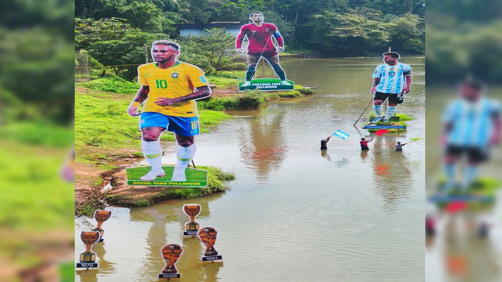 മലയാളികളും ഫിഫയുടെ പോസ്റ്റിന് കമന്റുമായി എത്തിയിട്ടുണ്ട്.പുല്ലാവൂർ പുഴയിൽ ആദ്യം സ്ഥാപിച്ചത് മെസ്സിയുടെ കട്ടൗട്ടാണ് . പിന്നാലെ ഉയർന്നു നെയ്മറിന്റെയും ഒരു പടുകൂറ്റൻ കട്ടൗട്ട്. പിന്നെ കേരളക്കരയിലെ ഫുട്ബോൾ ആരാധകർ കണ്ടത് കട്ടൗട്ടിനെ ചൊല്ലിയുള്ള വിവാദങ്ങളായിരുന്നു. പുഴയുടെ സ്വാഭാവിക ഒഴുക്ക് തടയുമെന്ന പരാതിയുമായി അഭിഭാഷകനായ ശ്രീജിത്ത് പെരുമന രംഗത്ത് വരികയായിരുന്നു. പരാതിയുടെ അടിസ്ഥാനത്തിൽ മെസിയുടെയും നെയ്മറിന്റെയും വൈറൽ കട്ടൗട്ടുകൾ നീക്കം ചെയ്യാൻ ചാത്തമംഗലം പഞ്ചായത്ത് സെക്രട്ടറി നിർദേശിച്ചു.