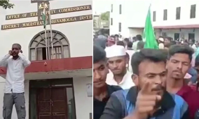 ശിവമൊഗ്ഗ: ബാങ്ക് വിളിക്കെതിരായ ബി.ജെ.പി നേതാവ് കെ.എസ്. ഈശ്വരപ്പയുടെ പ്രസംഗത്തില് പ്രതിഷേധിച്ച് ജില്ല കലക്ടറുടെ ഓഫിസിന് മുമ്ബില് ബാങ്ക് വിളിച്ച് മുസ്ലിം യുവാക്കളുടെ പ്രതിഷേധം.