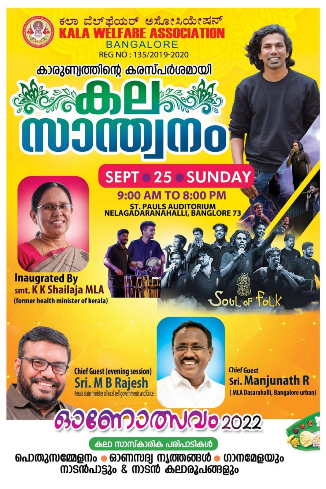ദാസറഹള്ളി : ബാംഗ്ലൂരിലെ പ്രമുഖ സാമൂഹ്യ സംഘടനയായ കല വെൽഫെയർ അസോസിയേഷന്റെ ഓണാഘോഷവും. കാരുണ്യ പദ്ധതിയായ കല സ്വന്തനത്തിന്റെ ഉദ്ഘടനവും സെപ്റ്റംബർ 25 ഞായറാഴ്ച രാവിലെ 11.30 നു കേരളത്തിന്റെ മുൻ ആരോഗ്യ വകുപ്പ് മന്ത്രി ശ്രീമതി. കെ കെ ശൈലജ ടീച്ചർ നിർവഹിക്കുന്നു. പ്രസ്തുത പരിപാടിയിൽ കേരള exise വകുപ്പ് മന്ത്രി എം ബി രാജേഷ് മുഖ്യ അഥിതിയായി പങ്കെടുക്കുന്നതാണ്.