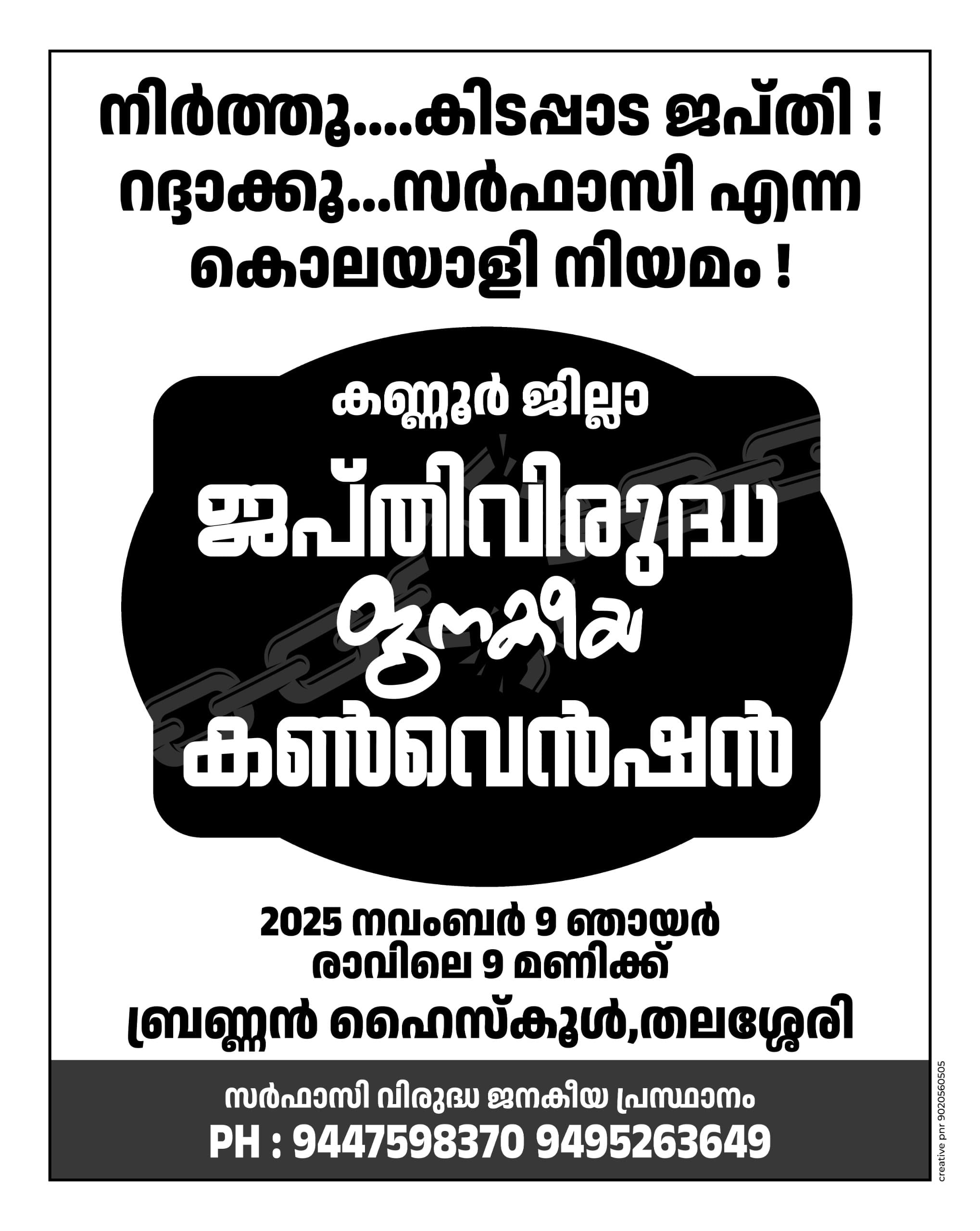 2025 നവമ്പർ 9 ഞായറാഴ്ച സംസ്ഥാന നേതാക്കൾ പങ്കെടുക്കുന്നു വിപുലമായ രീതിയിൽ ജില്ലാ കൺവെൻഷൻ നടത്താൻ യോഗം തീരുമാനിച്ചു. എല്ലാവരും തലശ്ശേരി ബിഎംപി ഹൈസ്കൂളിൽ8 മണിക്ക് എത്തിച്ചേരണമെന്ന് വിനീതമായി അഭ്യർത്ഥിക്കുന്നു