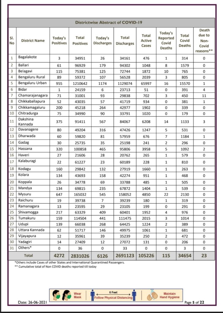 ബാംഗ്ലൂർ: സംസ്ഥാനത്ത് ഇന്ന് 4,272 പേർക്ക് കോവിഡ് സ്ഥിരീകരിച്ചു, നിലവിൽ സംസ്ഥാനത്തെ കോവിഡ് രോഗികളുടെ എണ്ണം 1,05,226. ഇന്ന് രോഗമുക്തരായവരുടെ എണ്ണം 6126, ഇതോടെ ആകെ രോഗമുക്തരായവരുടെ എണ്ണം 2691123 ആയി. കോവിഡ് മൂലം ഇന്ന് റിപ്പോർട്ട്‌ ചെയ്തത് 115 മരണം. സംസ്ഥാനത്തു കോവിഡ് മൂലം മരണപെട്ടവരുടെ ഇതുവരെ ഉള്ള ആകെ എണ്ണം 34,654 ആയി. കർണാടകയിലെ ആകെ കോവിഡ് ബാധിച്ചവരുടെ എണ്ണം 28,31026.