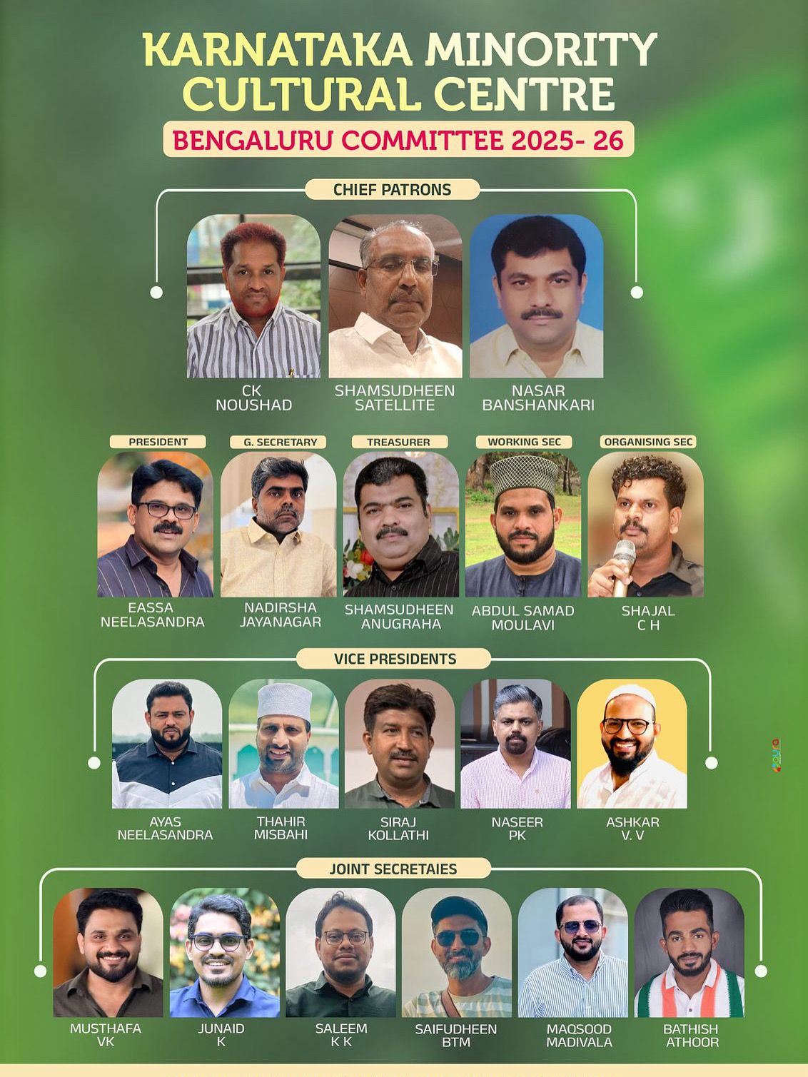 ജോയിന്റ് സെക്രട്ടറിമാർ : മുസ്തഫ വി കെ , ജുനൈദ് കെ , സലീം കെ കെ , സൈഫുദ്ധീൻ ബി ടി എം , മഖ്സൂദ് മടിവാള , ബാതിഷ് ടിപ്സാന്ദ്ര . ട്രഷറർ : ശംസുദ്ധീൻ അനുഗ്രഹ , എക്സികുട്ടീവ് മെമ്പർമാർ : , സൈഫുദ്ധീൻ കെ ആർ പുരം , യാക്കൂബ് സിങ്സാന്ദ്ര, ഷമീം കൊടഗ് , ഹമീദ് വി എം , റഷീദ് ജാലഹള്ളി , അലി മജെസ്റ്റിക് , ഫാറൂഖ് മജെസ്റ്റിക് , സലാം മാർക്കം റോഡ് . മീഡിയ ചെയർമാൻ : സാദിഖ് യഹ്യ സുള്ളിയ , കൺവീനർമാർ : ബിലാൽ മജെസ്റ്റിക് , റഷീദ് ഹെബ്ബാൾ , എന്നിങ്ങനെ 31 അംഗ വർക്കിംഗ് കമ്മിറ്റിയെ ഐക്യ ഖണ്ഡേന തിരഞ്ഞെടുത്തു .