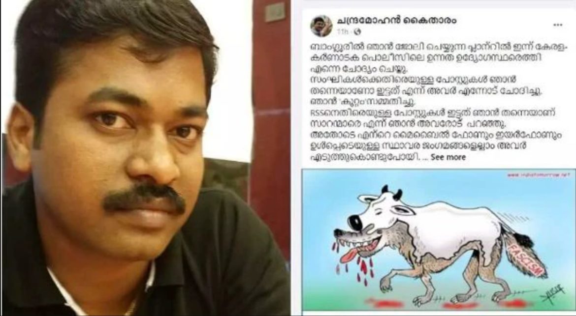 ബെംഗളൂരുവില് ജോലി ചെയ്യുന്ന ചന്ദ്രമോഹന് കൈതാരം എന്ന യുവാവാണ് ഇക്കാര്യം വെളിപ്പെടുത്തി ഫേസ്ബുക്കില് കുറിപ്പ് പങ്കുവെച്ചത്. ഫേസ്ബുക്കിലൂടെ നിരന്തരമായി ആര്എസ്എസിനെ വിമര്ശിച്ച് ഇദ്ദേഹം പോസ്റ്റുകള് പങ്കുവെക്കാറുണ്ട്. മൊബൈല് ഫോണും ഇയര് ഫോണും പൊലീസ് കൊണ്ടുപോയെന്നും അദ്ദേഹം പറഞ്ഞു.