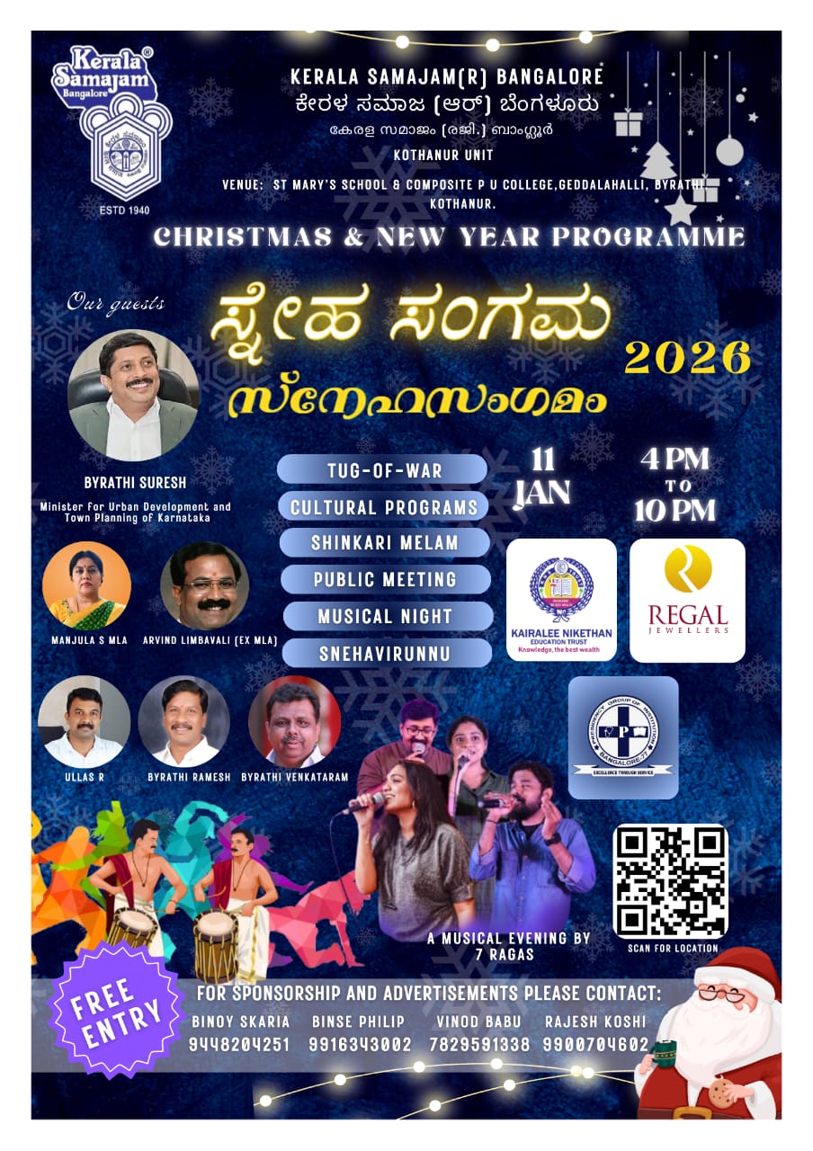 കേരളസമാജം (R) ബാംഗ്ലൂർ കൊത്തന്നൂർ യൂണിറ്റ് ക്രിസ്ത്മസ് ന്യൂ ഇയർ പ്രോഗ്രാം നടത്തുന്നു,. ജനുവരി 11 ഞായറാഴ്ച വൈകുന്നേരം 4 മുതൽ നടക്കുന്ന പരിപാടി നഗരവികസനവകുപ്പ് മന്ത്രി ശ്രീ ബൈരതി സുരേഷ് ഉൽഘാടനം ചെയ്യും.എം എൽ എ മഞ്ജുള, മുൻ എം എൽ എ അരവിന്ദ് ലിംബാവലി, ഉല്ലാസ് ആർ, ബൈരതി രമേശ്, വെങ്കടരാം,സമാജം പ്രസിഡന്റ് ഹനീഫ്, ജനറൽ സെക്രട്ടറി റെജികുമാർ എന്നിവർ മുഖ്യതിഥികളാകും, ഇന്റർ സോൺ വടം വലി, ശിങ്കാരിമേളം,കലാപരിപാടികൾ സെവൻസ് രാഗാസ് അവതരിപ്പിക്കുന്ന ഗാനസന്ധ്യ, സ്നേഹവിരുന്ന് എന്നിവ ഉണ്ടാകും