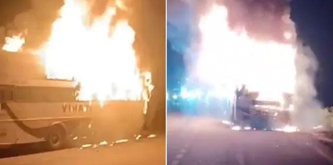 ഡ്രൈവർ ഉടൻ തന്നെ ഇടതുവശത്തേക്ക് ബസ് മാറ്റി സുരക്ഷിതമായി പാർക്ക് ചെയ്തു, യാത്രക്കാരെ അറിയിച്ചു. അടിയന്തര എക്സിറ്റ് ഉപയോഗിച്ചും ജനാലകള് തകർത്തും അവർ പുറത്തിറങ്ങി. ബെംഗളൂരു വഴി റായ്ച്ചൂരിലേക്ക് പോവുകയായിരുന്ന ബസ്, അഗ്നിശമന സേനാംഗങ്ങള് സ്ഥലത്തെത്തുന്നതിന് മുമ്ബ് മിനിറ്റുകള്ക്കുള്ളില് ചാരമായി. ഹൈദരാബാദ്- വിജയവാഡ ദേശീയപാതയിലാണ് അപകടമുണ്ടായത്. സ്വകാര്യ എസി ട്രാവല്സ് ബസിനാണ് തീ പിടിച്ചത്. ബസ് പൂർണമായും കത്തി നശിച്ചു.വിഹാരി ട്രാവല്സ് എന്ന സ്വകാര്യ സ്ലീപ്പർ ബസിനാണ് ഇന്ന് പുലർച്ചെ തീപിടിച്ചത്. ഹൈദരാബാദിലെ ബിഎച്ച്ഇഎല് എന്ന സ്ഥലത്തു നിന്ന് നെല്ലൂരിലേക്ക് പോവുകയായിരുന്നു ബസ്. പുലർച്ചെ 1.30 ഓടെയാണ് സംഭവമെന്ന് ചിറ്റ്യാല പൊലീസ് പറഞ്ഞു. ഡ്രൈവറും കണ്ടക്ടറും ചേർന്ന് എല്ലാ യാത്രക്കാരെയും പുറത്തിറക്കി.”ബസിനുള്ളില് പെട്ടെന്ന് തീ പടർന്നുപിടിക്കുകയായിരുന്നു. അപകട വിവരം ലഭിച്ച ഉടൻ തന്നെ ഞങ്ങളുടെ സംഘം ഫയർ ഫോഴ്സ് സംഘത്തോടൊപ്പം സ്ഥലത്തെത്തി തീ നിയന്ത്രണ വിധേയമാക്കി”- പൊലീസ് പറഞ്ഞു. തീപിടിത്തത്തിന്റെ കാരണം കണ്ടെത്താൻ അന്വേഷണം തുടങ്ങിയെന്നും പൊലീസ് അറിയിച്ചു.കഴിഞ്ഞ മാസം ആന്ധ്രാപ്രദേശിലെ കുർണൂലിലുണ്ടായ ബസ് തീപിടിത്തത്തില് 20 പേർ മരണപ്പെട്ടിരുന്നു. ബൈക്കുമായി ഉണ്ടായ ആക്സിഡന്റിനെ തുടർന്ന് ബസിനടിയില് കുടുങ്ങിയ ബൈക്കിലെ പെട്രോള് ടാങ്കില് നിന്ന് തീയുണ്ടാവുകയും അത് മുഴുവൻ വാഹനത്തിലേക്ക് പടരുകയും ചെയ്യുകയായിരുന്നു. ബെംഗളൂരുവിലേക്ക് പോകുകയായിരുന്ന ബസും ബൈക്കും കൂട്ടിയിടിച്ചാണ് അപകടമുണ്ടായത്.