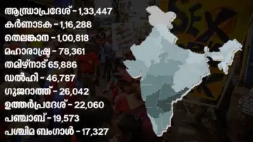 2021 ലെ ആരോഗ്യ കുടുംബക്ഷേമ മന്ത്രാലയത്തിന്റെ കണക്ക് പ്രകാരം ഏറ്റവും കൂടുതല് ലൈംഗിക തൊഴിലാളികള് വരുന്നത് ആന്ധ്രപ്രദേശില് നിന്നാണ്. 1,33,447 പേര്. തൊട്ടുപിന്നാലെ തന്നെ കര്ണാടകയും തെലങ്കാനയുമുണ്ട്. 1,16,288 പേര് കര്ണാടകയിലും 1,00,818 പേര് തെലങ്കാനയിലുമുണ്ട്. മഹാരാഷ്ട്രയില് നിന്ന് 78,361 പേരും തമിഴ് നാട്ടില് നിന്ന് 65,886 പേരുമാണ് ലൈംഗിക തൊഴിലാളികളായി ജീവിതം മുന്നോട്ട് കൊണ്ടുപോകുന്നത്. ചുറ്റുമുള്ള സംസ്ഥാനങ്ങളുമായി താരതമ്യം ചെയ്യുമ്ബോള് കേരളത്തില് നിന്നുള്ള ലൈംഗിക തൊഴിലാളികളുടെ എണ്ണം കുറവാണ്. 17,000 പേരാണ് കേരളത്തില് തിരിച്ചറിഞ്ഞിട്ടുള്ള ലൈംഗിക തൊഴിലാളികളുടെ എണ്ണം. എന്നാല് ദേശീയ കണക്കില് ഇത് കുറവായിട്ടല്ല രേഖപ്പെടുത്തുന്നത്.
