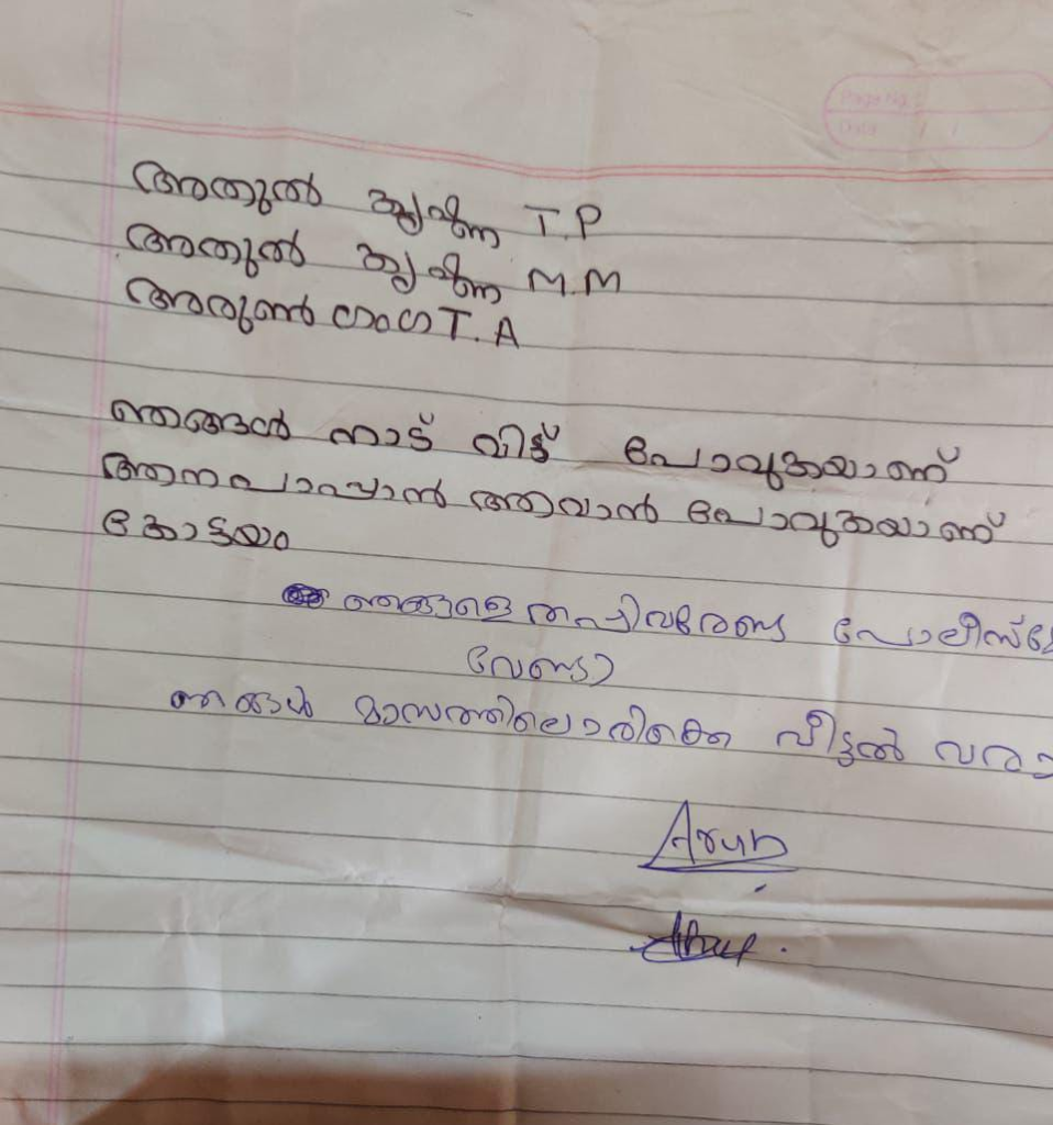 പഴഞ്ഞി ഗവണ്മെന്റ് സ്കൂളിലെ മൂന്ന് എട്ടാംക്ലാസ് വിദ്യാര്ത്ഥികളാണ് ഒരു കത്തെഴുതിവച്ച് യാത്ര പോയത്. ഞങ്ങള് നാട് വിട്ടുപോകുകയാണ്. ആനപ്പാപ്പാന് ആകാന് പോകുകയാണ്. ഞങ്ങളെ തപ്പി പൊലീസ് വരേണ്ട. മാസത്തിലൊരിക്കല് ഞങ്ങള് വീട്ടില് വരാം. ഇതാണ് കത്തില് പറയുന്നത്.