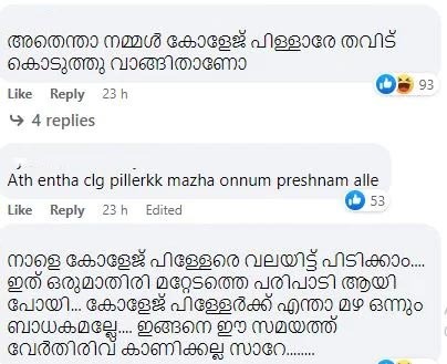 ‘കോളേജ് പിള്ളേർ എന്താ വാട്ടർ പ്രൂഫാണോ’.. ‘കോളജ് കുട്ടികൾ വരുമ്പോ മഴ മാറി നിൽക്കുമോ’.. ‘കോളേജ് പിള്ളാര് നീന്തി വരണമോ സർ’.. എന്നിങ്ങനെ നീളുന്നു കമന്റുകൾ. കമൻറുകൾക്കൊപ്പം ട്രോളുകളും നിറഞ്ഞു കഴിഞ്ഞു. സ്കൂൾ വിദ്യാർഥികൾക്ക് അവധി നൽകിയ കളക്ടറെ അഭിനന്ദിക്കാനും കുട്ടികളും രക്ഷിതാക്കളും മറന്നില്ല.