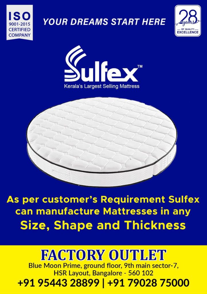 കേരളത്തിലെ ഏറ്റവും വലിയ മാട്രസ്സ് മാനുഫാക്ചട്യൂറിങ് കമ്പനിയായ സുൾഫെക്സ് മാട്രസ്സിന്റെ ബെംഗളൂരു ഫാക്ടറിഔട്ട് ലെറ്റിൽ നടക്കുന്ന ഓഫറുകളുടെ ഉത്സവകാലം .മെത്ത വാങ്ങാൻ ആഗ്രഹിക്കുന്നവർക്കുള്ള ഒരു മികച്ച അവസരമാണ് ഒരുക്കിയിരിക്കുന്നത് , കമ്പനി നേരിട്ട് ഉപഭോകതാക്കളിലേക്കെത്തിക്കുന്നതിനാൽ ഹോൾ സെയ്ൽ വിലയിൽ ഇടനിലക്കാരില്ലാതെ തെന്നെ കമ്പനി ഗ്യാരണ്ടിയോടെ മെത്തകൾ വാങ്ങാനും ഈ അവസരം ഉപയോഗിക്കാം .സുൾഫെക്സ് മാട്രസ്സിന്റെ ബാംഗ്ലൂർ ഷോറൂമിൽ നിന്നും മെത്തകൾ വാങ്ങുന്ന ഓരോ കസ്റ്റമർക്കും വമ്പിച്ച ക്യാഷ് ഡിസ്കൗണ്ടിൽ മെത്തകൾ സ്വന്തമാക്കാം. കെമിക്കൽ വേസ്റ്റില്ലാതെ ശുദ്ധമായ ചകിരിനാരും റബ്ബർ പാലും ചേർത്തുണ്ടാക്കുന്ന റബ്ബറൈസ്ഡ് കയർ മെത്തകൾ യഥാർത്ഥ വിലയിൽ നിങ്ങൾക്ക് സ്വന്തമാക്കാം.കൂടാതെ സ്പ്രിങ് മാട്രസ് , മെഡിബോൻഡ് , മെമ്മറി ഫോം മാട്രസ് മുതലായവ കമ്പനി വിലയിൽ ലഭിക്കും.