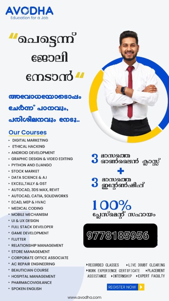 കാർണിവൽ ഇൻഫോപാർക്കിൽ നിന്നും avodha നൽകുന്നു നിങ്ങൾക്ക് വേണ്ടി തൊഴിൽ സാധ്യതയുള്ള 24 കോഴ്സുകൾ വെറും 2800 രൂപക്ക് അതും 100% 💯 പ്ലേസ്മെന്റ് നോടൊപ്പം.