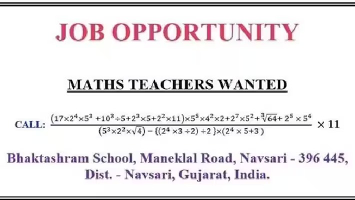 ഗുജറാത്തിലെ നവസാരി ജില്ലയിലുള്ള ഭക്താശ്രമം സ്കൂളിൽ ഗണിത അധ്യാപകന്റെ ഒഴിവിലേക്ക് ഉദ്യോഗാർത്ഥികളെ തേടിക്കൊണ്ട് നൽകിയ പത്ര പരസ്യമാണ് ഇത്തരത്തിൽ വൈറലായത്. പരസ്യം സോഷ്യൽ മീഡിയയിൽ വൈറൽ ആയതോടെ നിരവധിയാളുകൾ തങ്ങളുടെ അഭിപ്രായവുമായി രംഗത്തെത്തി. ഈ പരസ്യത്തിന്റെ ഉപജ്ഞാതാവ് ആരാണെങ്കിലും വളരെ നല്ലൊരു ആശയം എന്നായിരുന്നു പരസ്യം കണ്ട ചിലർ കുറിച്ചത്.
