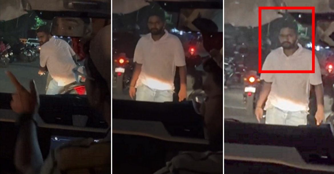 സ്കൂട്ടർ റൈഡർ വാഹനത്തിന്റെ പാത പലതവണ തടഞ്ഞ് നിർത്താൻ ശ്രമിക്കുന്നതും, കാർ മുന്നോട്ട് പോകുന്നതും, സ്‌കൂട്ടർ റൈഡർ ഒടുവിൽ വാഹനം തടഞ്ഞു, കാർ പോകാൻ സമ്മതിക്കാതെ നിർത്തിക്കുന്നതും കാണാം.തുടർന്ന് റൈഡർ സ്കൂട്ടറിൽ നിന്ന് ഇറങ്ങി വാഹനത്തിനടുത്തേക്ക് വരുന്നതും, ഡ്രൈവർ ഇതിനകം പോലീസിനെ വിളിച്ചിരുന്നുവെന്നും സമീപത്തുള്ളവരോട് അധികൃതരുമായി ബന്ധപ്പെടാൻ ആവശ്യപ്പെട്ടതായും കാണുന്നു. ഇതിനിടെ വാഹനത്തിലുണ്ടായിരുന്ന മറ്റ് യാത്രക്കാർ ചില്ലു തുറക്കരുതെന്ന് ഡ്രൈവറോട് ആവശ്യപ്പെട്ടു. തുടർന്ന് റൈഡർ കാറിനെ ഭയപ്പെടുത്തുന്ന രീതിയിൽ ചുറ്റും നടക്കുന്നതയും വീഡിയോയിൽ കാണാം.