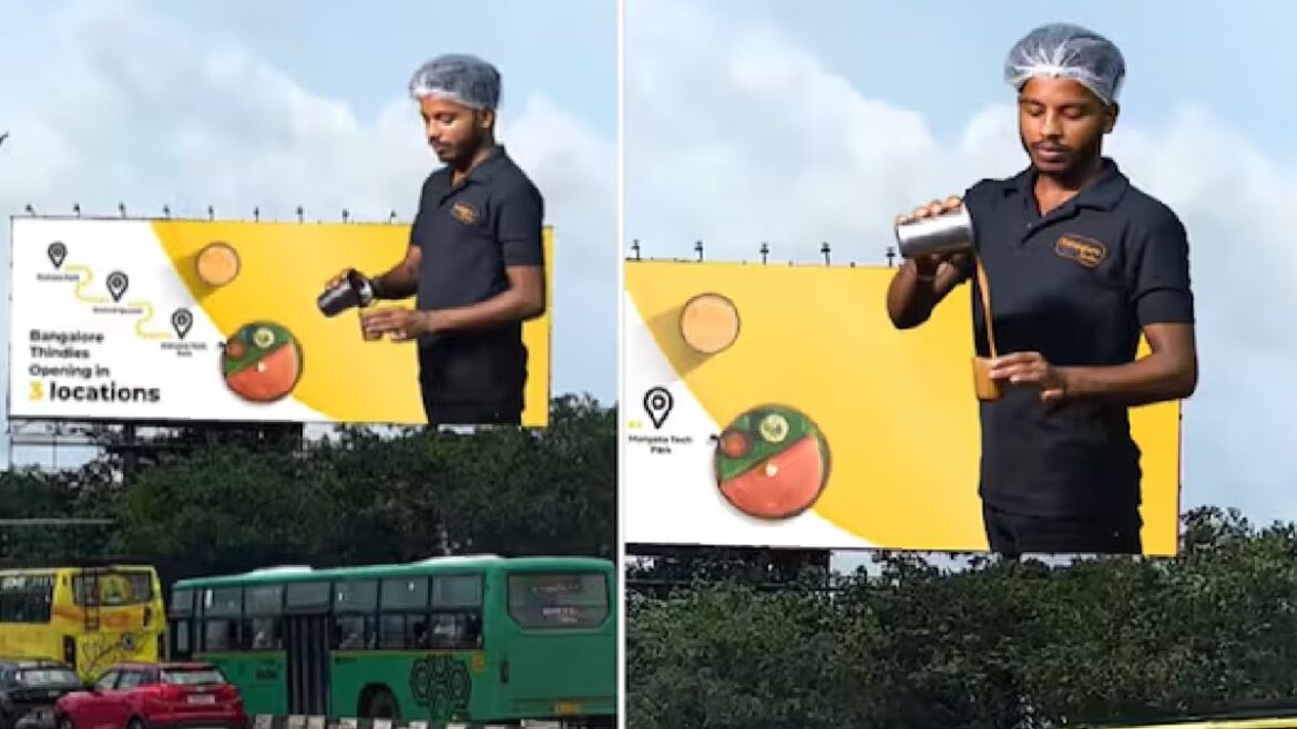 ബംഗളൂരുവില് എങ്ങനെയാണ് അത്യാധുനിക പരസ്യരീതികള് ഉണ്ടാകുന്നത് എന്ന് കാണിക്കുന്നതാണ് ഈ ബില്ബോർഡ് എന്ന് പറയാതെ വയ്യ. ഇതുവഴി പോകുന്നവരെയെല്ലാം ഈ പരസ്യബോർഡ് ആകർഷിച്ചു കൊണ്ടിരിക്കുകയാണ്. പിന്നാലെയാണ് അത് സോഷ്യല് മീഡിയയും ഏറ്റെടുത്തിരിക്കുന്നത്.റെസ്റ്റോറൻ്റ് ശൃംഖലയായ ബംഗളൂരു തിൻഡീസിന്റെയാണ് ഈ പരസ്യബോർഡ്. ബോർഡില് കാണുന്നത് ഒരാള് ഫില്ട്ടർ കോഫി ഗ്ലാസിലേക്ക് പകരുന്നതാണ്. 3D എഫക്ട് കൊണ്ടുതന്നെ യുവാവിന്റെ രൂപം ബില്ബോർഡില് നിന്നും കോഫി പകരുന്നതായിട്ടാണ് കാണുന്നത്. പീക്ക് ബംഗളൂരു മൊമന്റ് എന്ന് പറഞ്ഞുകൊണ്ട് എക്സില് (ട്വിറ്ററില്) ഇതിന്റെ വീഡിയോ പോസ്റ്റ് ചെയ്തിട്ടുണ്ട്. Bengalore Thindies തന്നെ ഇൻസ്റ്റഗ്രാമിലും വീഡിയോ പങ്കുവച്ചിട്ടുണ്ട്.